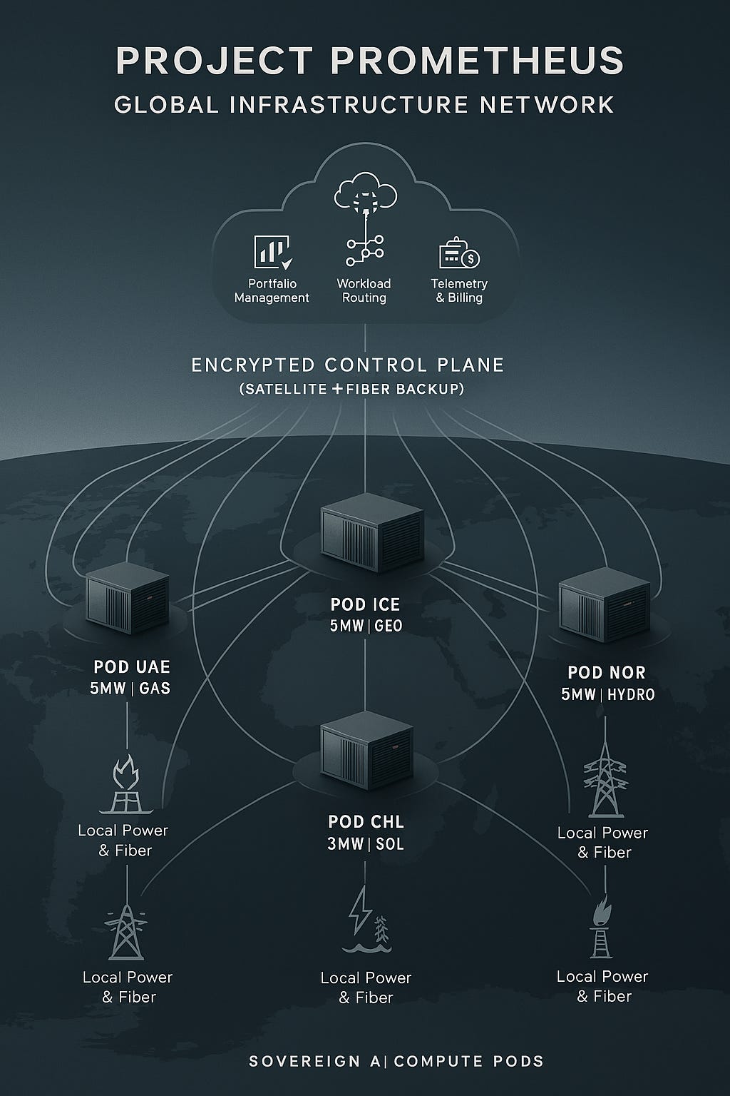 Part 14 of a recurring series that injects high-level business concepts in frontier tech infrastructure and geopolitical arbitrage designed to spark new ventures. Each post acts as a catalyst not a fully fleshed-out plan, but the seed of something bold, timely, and market-aware. Project Prometheus establishes a transformative model for global AI infrastructure deployment through secure, self-contained, remotely managed modular data centers”Black Box” enclaves positioned in energy-rich, connectivity-ready nations. This vision addresses the fundamental constraint facing AI scaling: the collision between exponential compute demand and the limitations of legacy power grids, geopolitical export controls, and capital constraints. Strategic Intent and Long-Term Goals: Primary Objective: Decouple AI compute scaling from local grid bottlenecks and geopolitical risk by creating a globally distributed, sovereign-enclave infrastructure model that turns electricity and connectivity into exportable services.