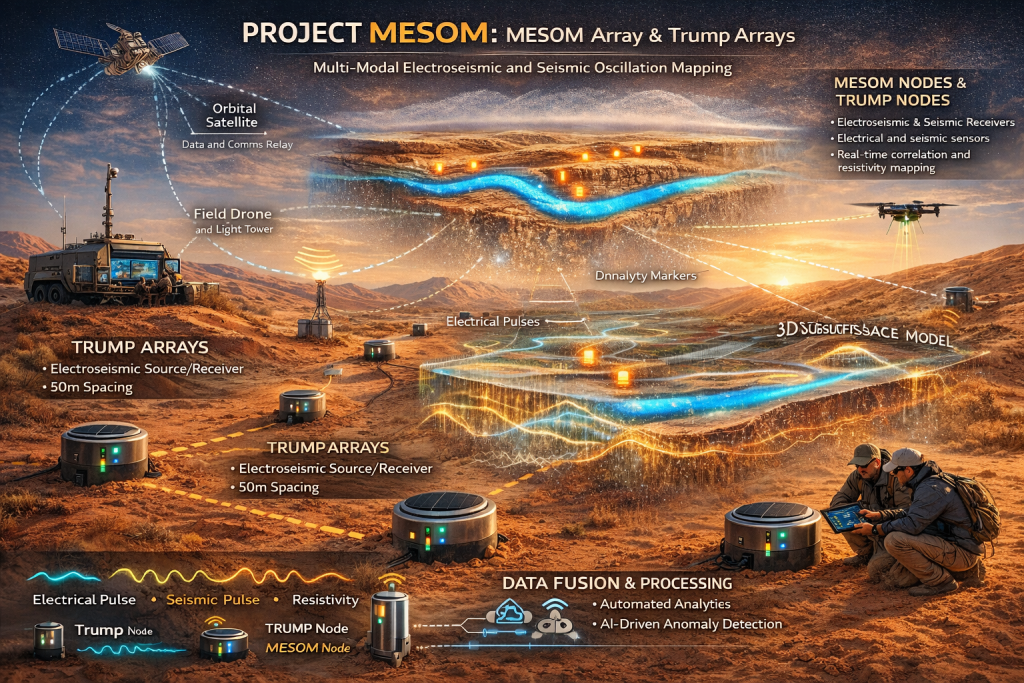 | Project MESOM: Multi-Modal Electroseismic and Seismic Oscillation Mapping. Comprehensive Framework Document | Defines the overall MESOM concept, including the sensing philosophy, Trump Array architecture, AI-driven data fusion, deployment models, and cross-domain use cases for subsurface intelligence. |